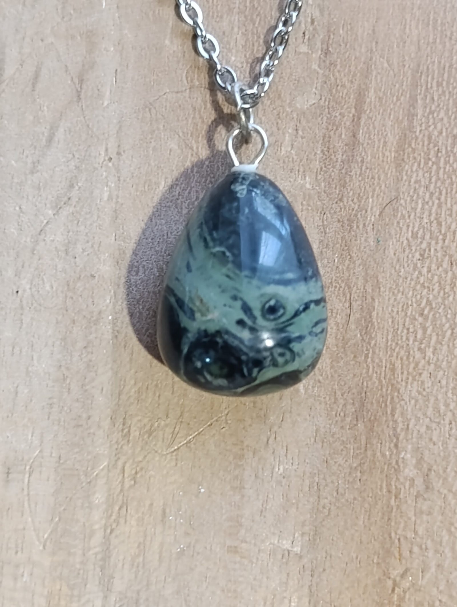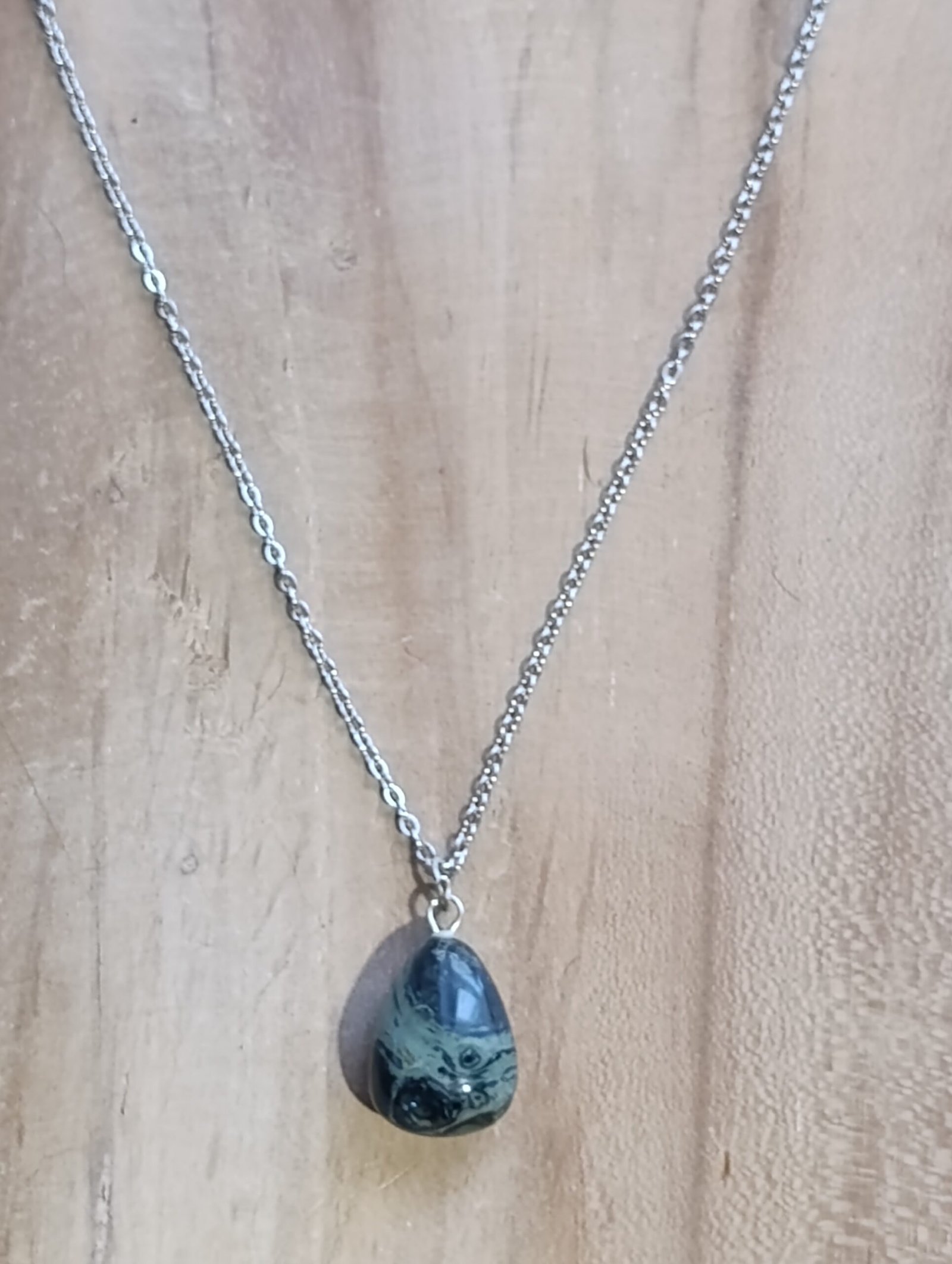 Ce pendentif en jaspe kambaba, d’environ 2 cm, est une véritable célébration de la nature et de la simplicité. Sa pierre semi-précieuse, connue pour ses magnifiques nuances vertes et noires, fait de ce bijou une pièce unique et intemporelle. Idéal pour ceux qui recherchent à la fois beauté naturelle et signification profonde.
